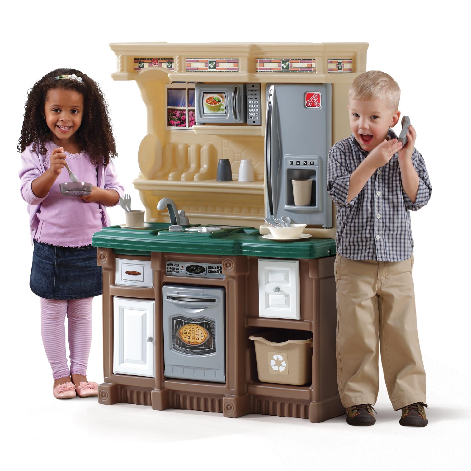 This realistic multi-activity play kitchen has so many premium features it just might inspire you to remodel your own! The Step2 LifeStyle Custom Kitchen II is equipped with a granite look countertop and stainless steel look oven microwave and refrigerator. Multiple drawers are ideal for storing pots pans forks and spoons. Real cooking sounds are produced by the special frying pan and boiling pot. Perfect for playdates!